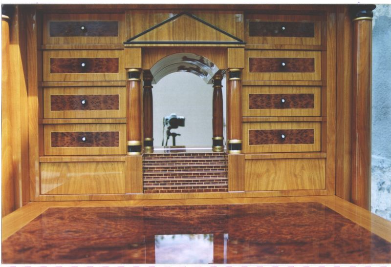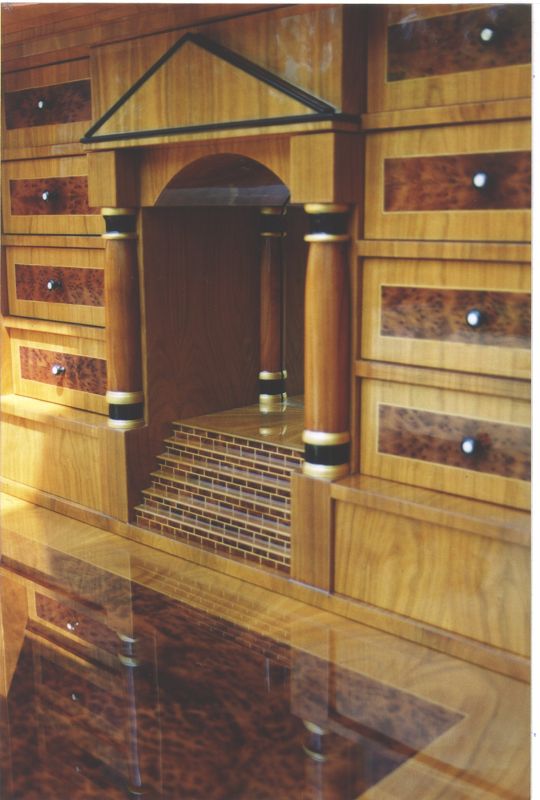 verwendete Holzarten: Vavona-Wurzelmaser, Kirsch, Buche, Ahorn, Ebenholz und Fichte