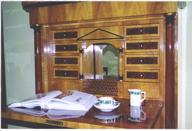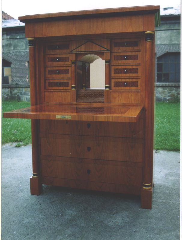 Der Biedermeierstil entwickelte sich in Österreich um die Zeit des Wiener Kongresses 1815 als Variante des Empirestils. Seine klare, nüchterne Formensprache ersetzte Monumentalität durch Funktionalität.Wir freuen uns, Ihnen einen Biedermeiersekretär vorstellen zu können, der - nach alter Tradition gebaut - selbst höchsten Ansprüchen gerecht wird. Handverlesene Hölzer der Kirsche, Vavona-Wurzelmaser, Ahorn, Buche, Fichte sowie Ebenholz wurden unter Verwendung altbewährter Verbindungsmethoden (Korpus und Laden gezinkt, Laufleisten gegradet (in Buche), Beistossrückwand ...) zu einer geschmackvollen Komposition vereint, die ganz im Sinne des Biedermeiers sowohl ästhetisch als auch funktional zu überzeugen versteht. So gewähren 3 geräumige sowie 8 kleinere Schubladen viel Platz und Ordnung an diesem sicherlich außergewöhnlichen und exquisiten Arbeitsplatz. Für Vertrauliches stehen weitere 5 Geheimfächer zur Verfügung. Viele weitere liebevoll gearbeitete Details warten darauf, von Ihnen entdeckt zu werden.